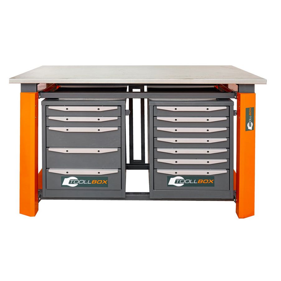 Главная особенность модели — комбинированные тумбы с разной логикой хранения. С одной стороны установлена тумба с 5 выдвижными ящиками, с другой — тумба с 7 ящиками. Такой набор помогает распределить оснастку по частоте использования: крупное и тяжелое — отдельно, расходники и измерительный инструмент — отдельно, а мелочевка не смешивается с тем, что постоянно берешь в руки. Обе тумбы оснащены петлями под навесной замок — удобно, если верстак стоит в общем цехе, на объекте или в мастерской, где к инструменту есть доступ у нескольких человек.